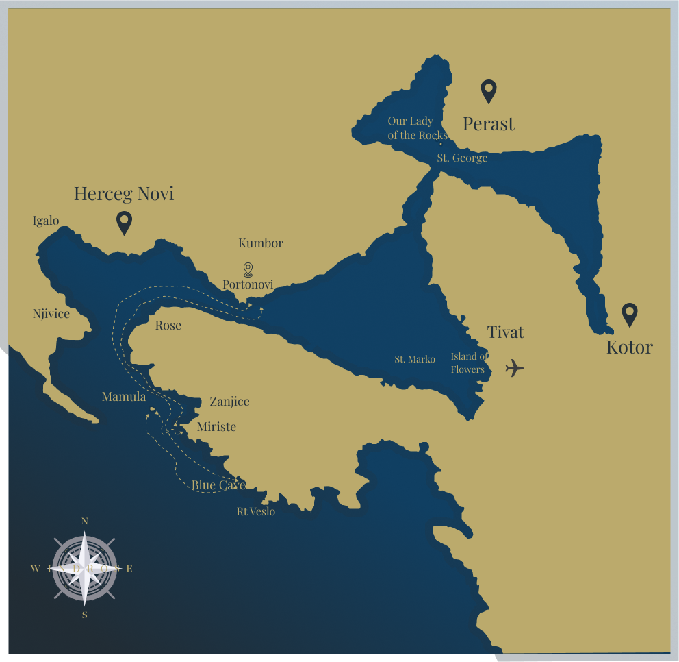 We start our tour from Portonovi Marina. First we will visit one of three submarine tunnels. They were built by Yugoslav Navy to keep submarines and navy ships out of sight. On the way to the Blue Cave, you will enjoy passing landscapes, small towns and picturesque islands. Blue cave is our second stop where you can enjoy 20 minutes of swimming and snorkeling. The water in the cave is crystal-clear and due to the surrounding rock composition, it creates a beautiful natural aquarium where you can see rocks and sea life on the bottom of the cave. After the refreshing break we will continue our journey with a panoramic sightseeing of Mamula island. Last destination of our trip is Miriste. 15 minutes break for swimming, sunbathing or snorkeling.